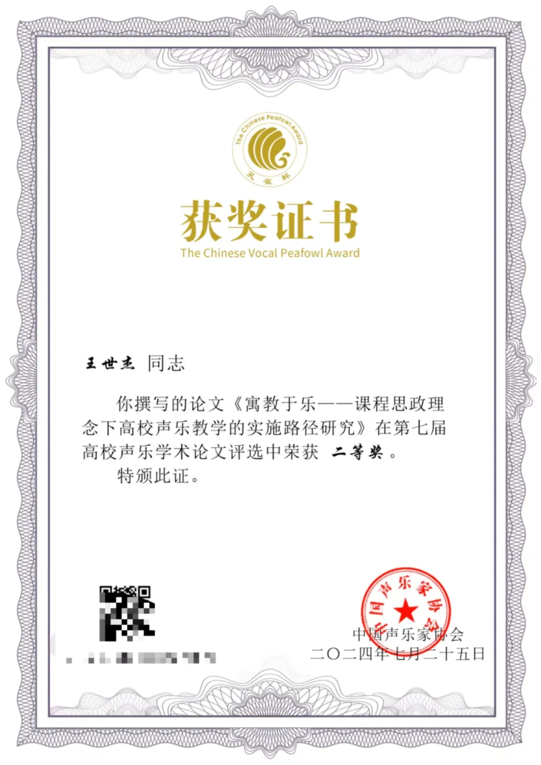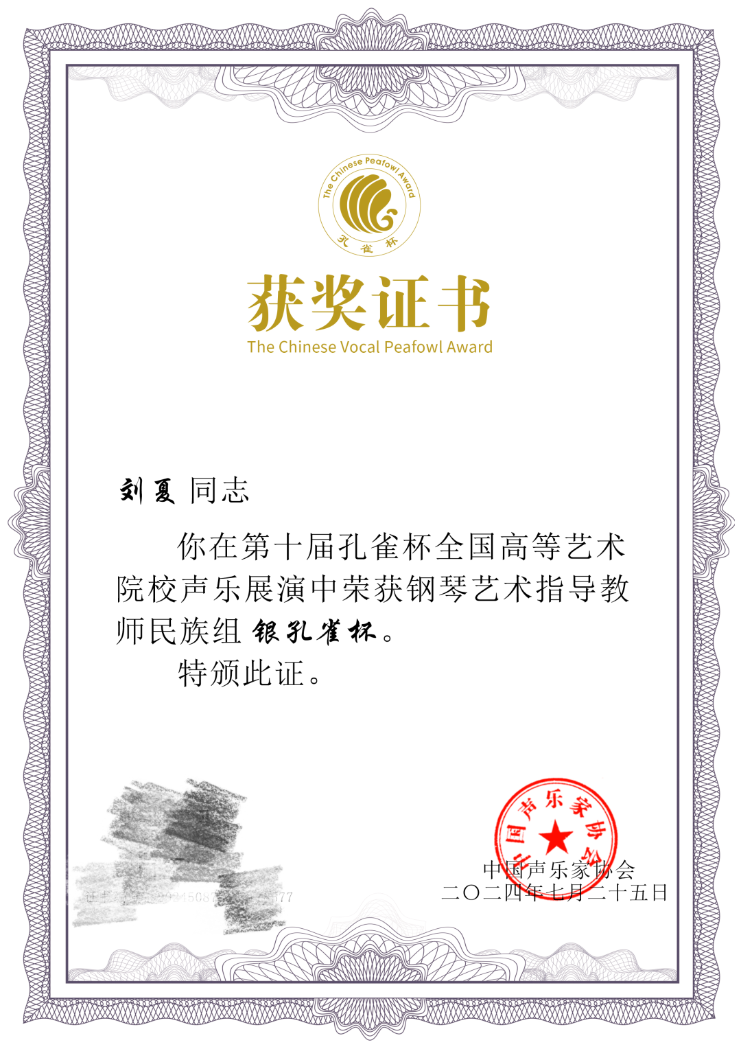 2024年7月18日至25日,第十届“孔雀杯”全国高等艺术院校声乐展演在广州举行。全国300余所高校近3700名师生参加了本次展演。经过初、复赛层层选拔,现场激烈角逐,数字媒体与表演学院表演专业钢琴教师刘夏,凭借其卓越的专业素养荣获本届钢琴艺术指导教师民族组银孔雀奖;表演专业教师王世杰论文荣获第七届高校声乐学术论文二等奖。