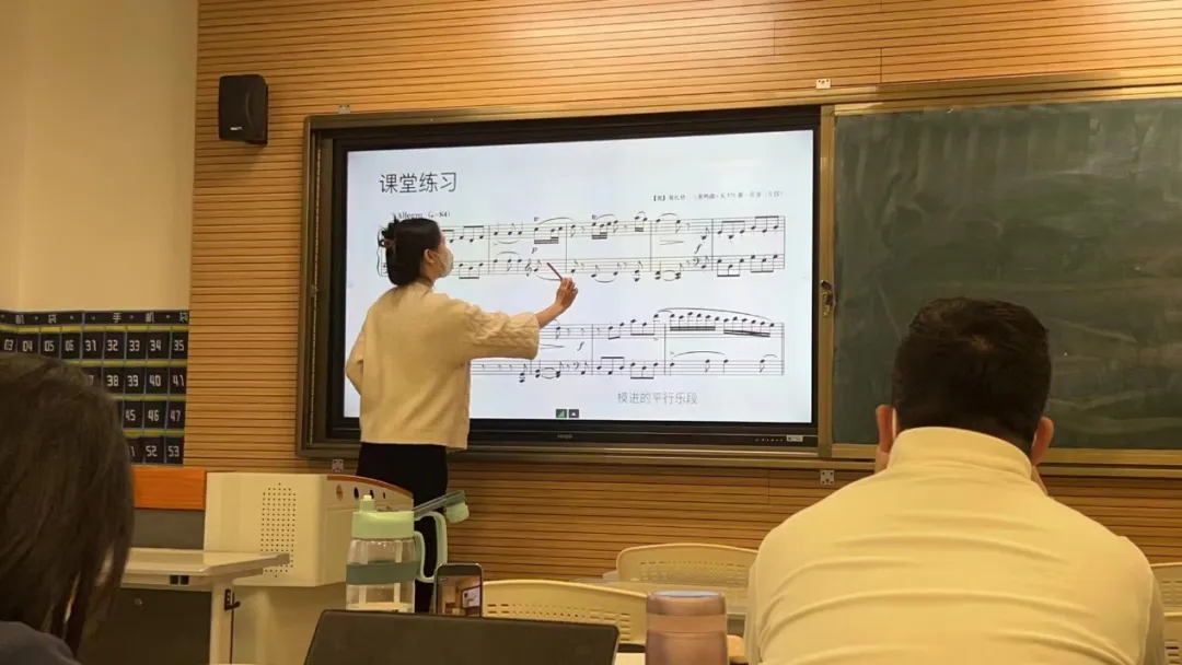 理论教师范菁老师带来的音乐理论课程《音程的转位》是大家都很期待的,教学过程中她语言精炼,逻辑思维严密。首先范老师以 “学习音程转位的意义”为导入,引发了大家的思考,新课讲解过程中通俗易懂的语言与谱例相结合,吸引着观摩教师的高度赞扬。同时,蒋鸣夏老师的《一段曲式的分类》也同样精彩,特别是讲解平行乐句、对比乐句时,她采用了动画图片,将复杂问题简单化,成为赛课活动的一大亮点。