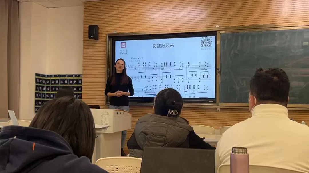 刘影老师的《长鼓敲起来》是一节声乐课,课堂活动中刘影老师的教学方法吸引了观摩老师们的兴趣,她采用了学生演唱、老师示范以及用手模仿长鼓节奏的敲击等等方法,得到了观摩老师的一致好评。