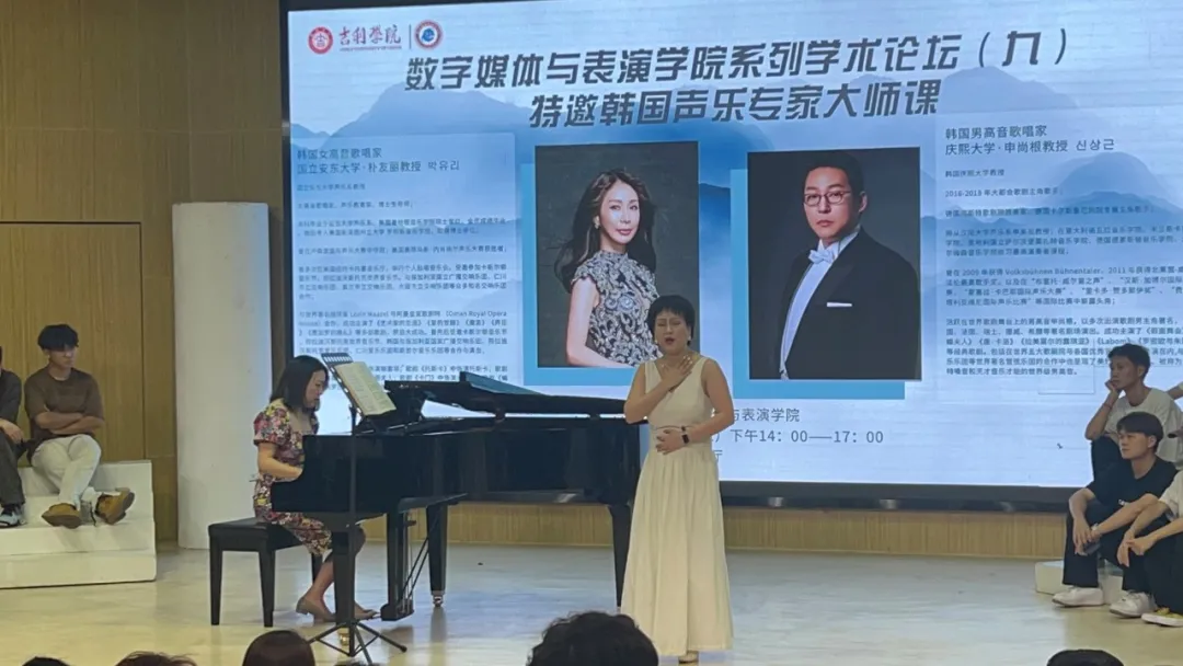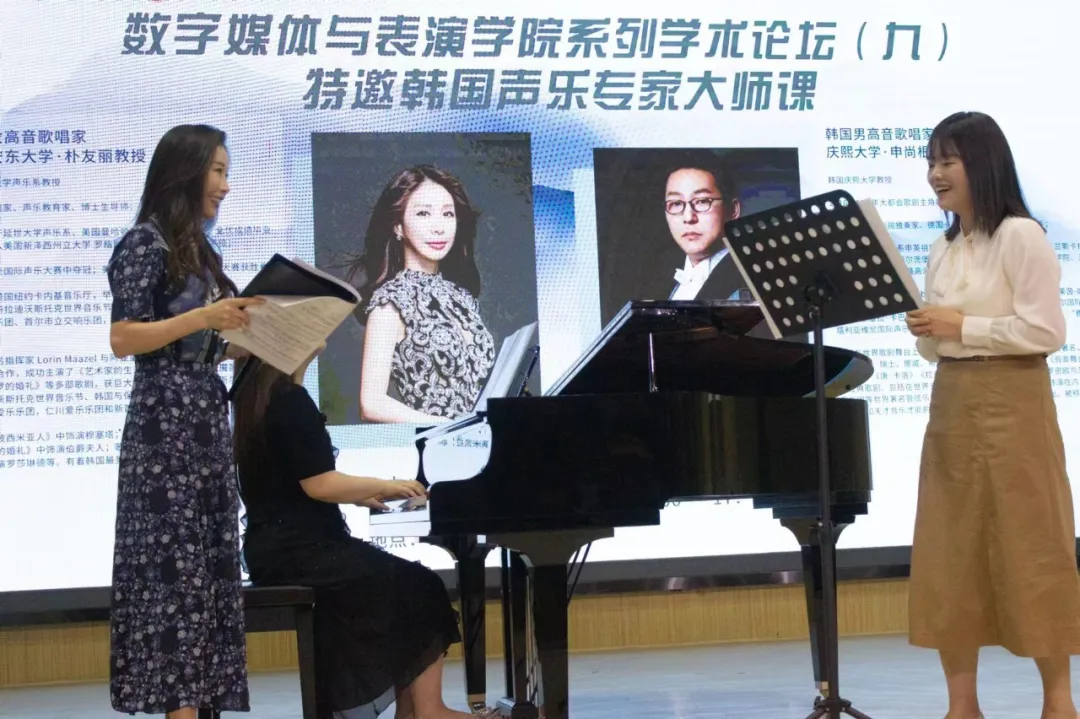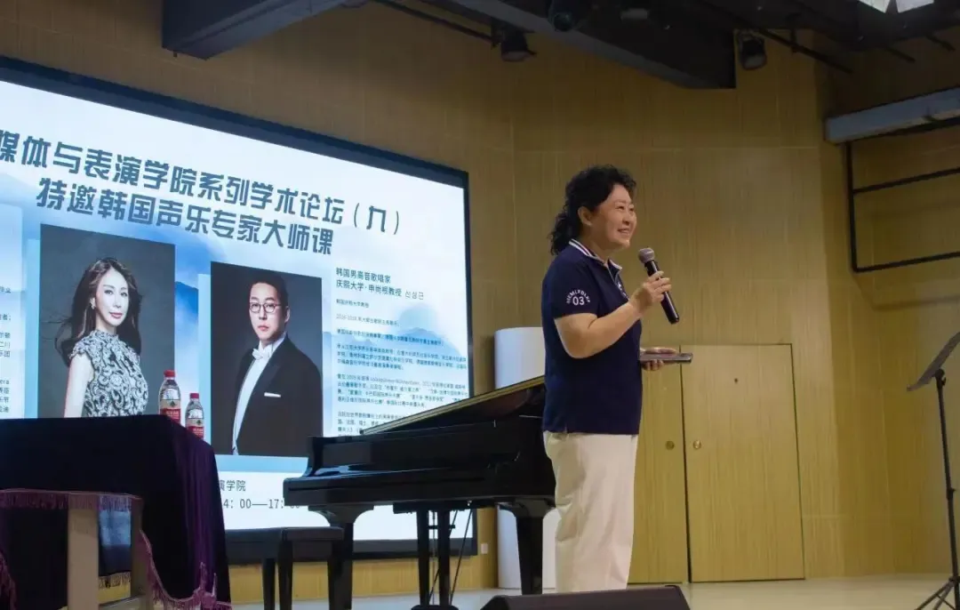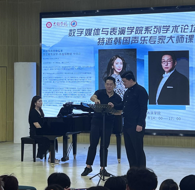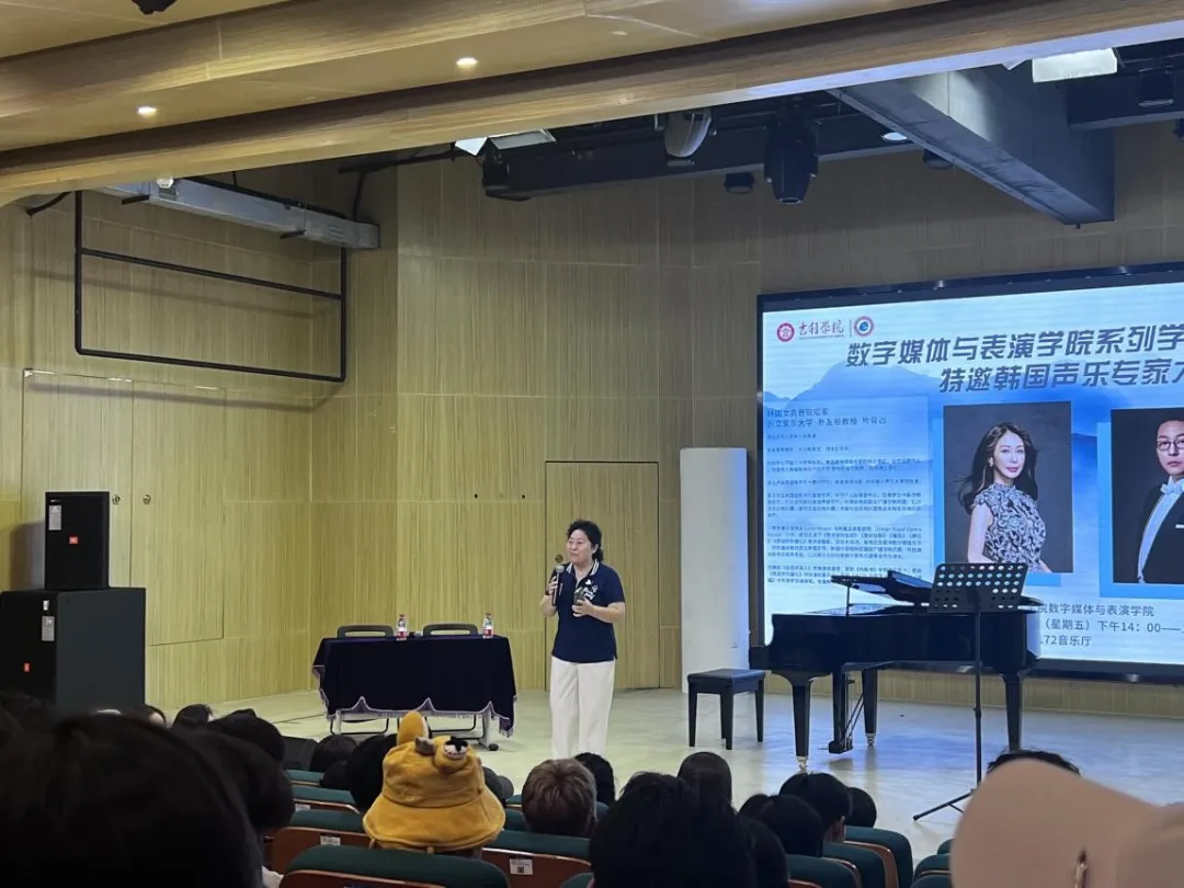 9月8日下午2:00,明德楼172音乐厅座无虚席,汇聚了满心期待的学子和老师们。“数字创新 唱响未来”系列学术论坛之九顺利开讲,本次讲座特邀韩国女高音歌唱家朴有丽教授和韩国男高音歌唱家申尚根教授来院作讲座,旨在为同学们搭建一个与国际音乐教育大师面对面交流的机会。