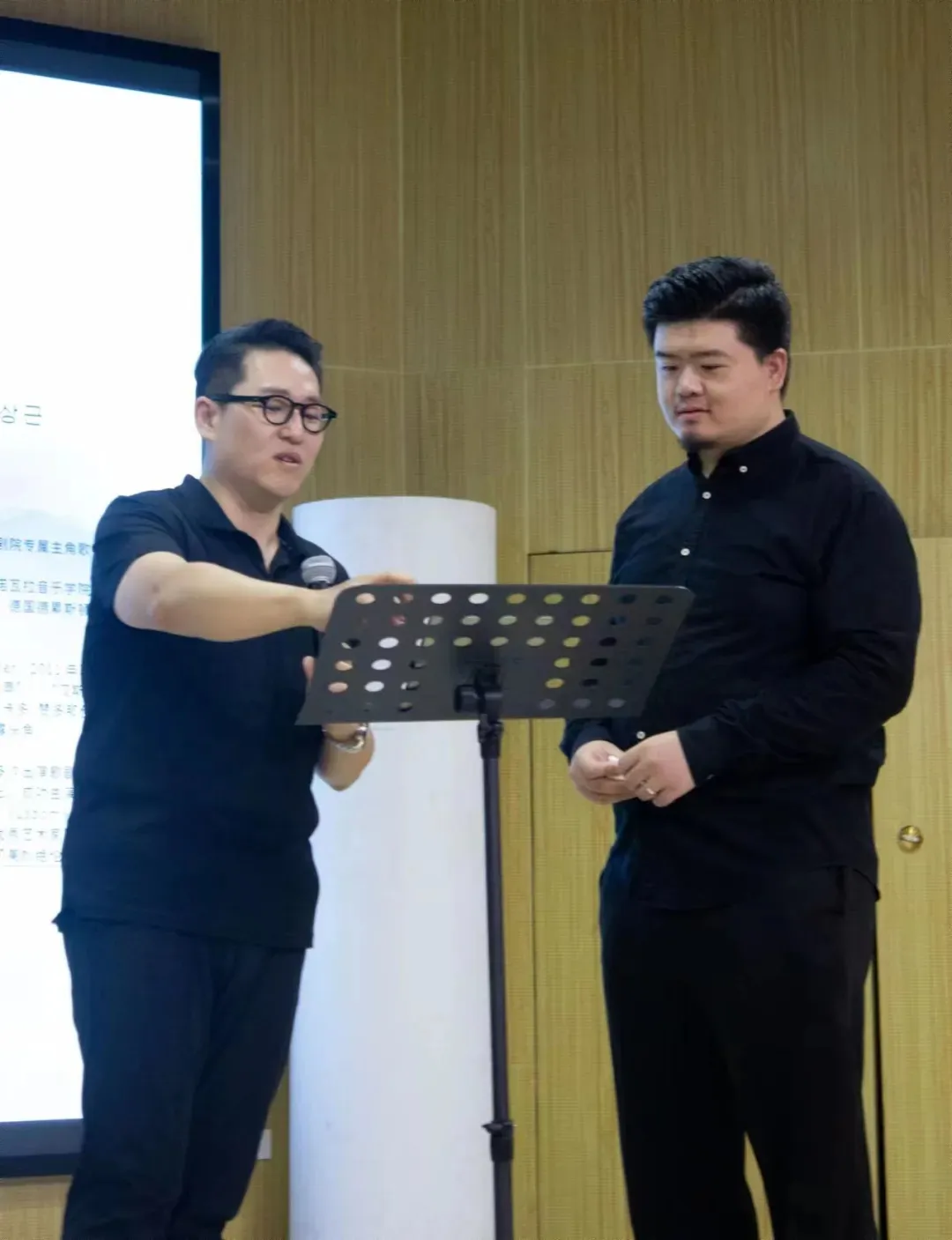 厚实而饱满的情感,时而低沉,时而高昂的男高音弥漫在整个音乐厅。全场屏息聆听,当曲子最后一个音符落下的时候,申尚根教授对我院老师表达了真诚地赞许,并逐字逐句从演唱气息的强弱到韩语的发音对我院教师进行指导与纠正。申尚根教授表示,“王世杰老师只学习了两个月的韩语,能唱到这样已经很厉害了”,王世杰老师就韩语声乐气息强弱的相关知识向申教授情况虚心请教。