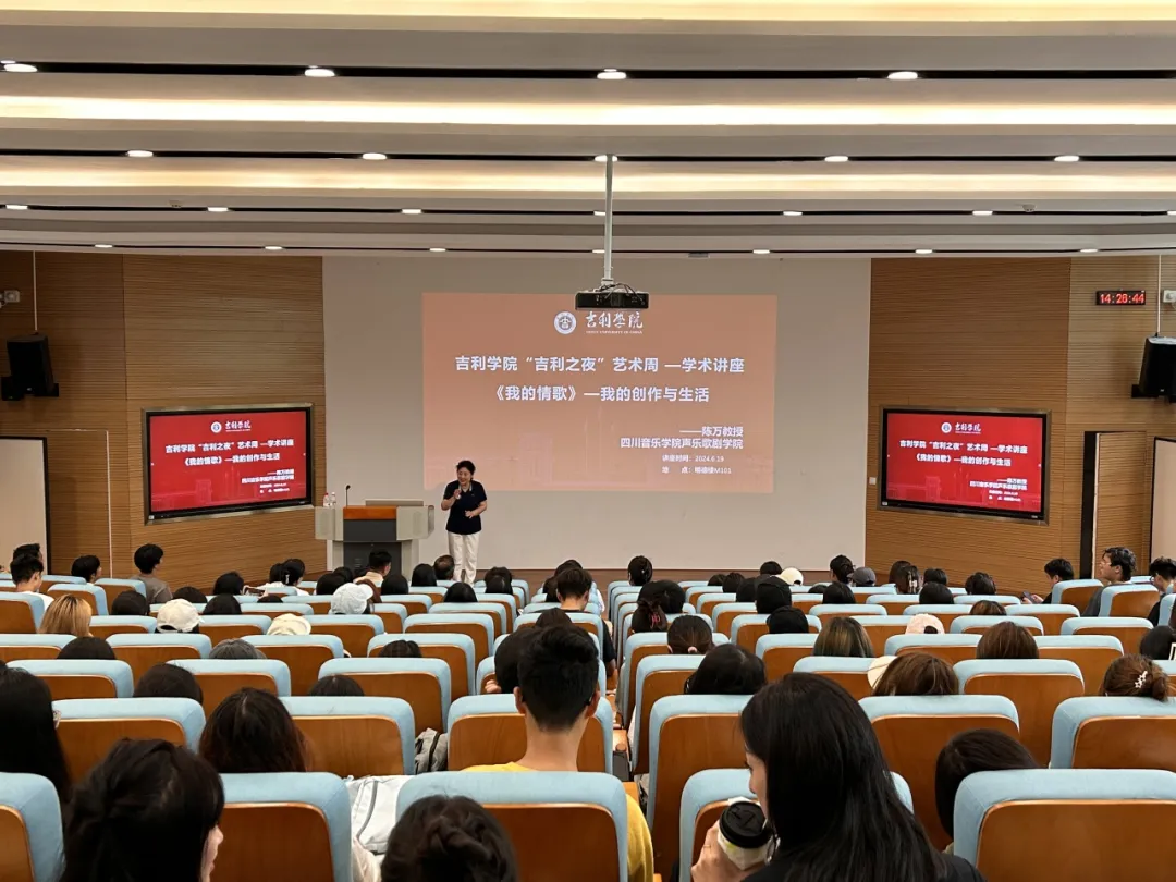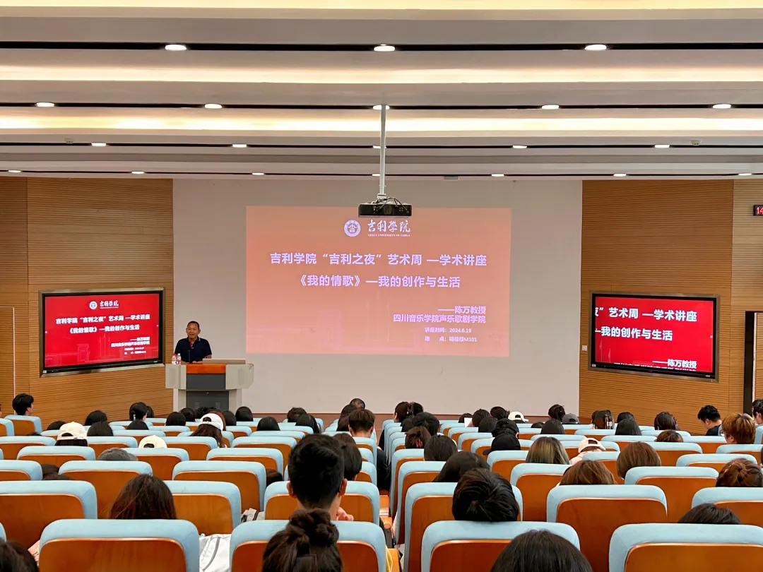 6月19日下午,四川音乐学院声乐歌剧学院陈万教授在明德楼101举办了“吉利之夜”艺术周讲座——《我的情歌》:我的创作与生活。此次讲座,陈教授以他丰富的音乐创作经验和独特的生活故事为线索,带领全校师生深入探索音乐与生活的交织奥秘。